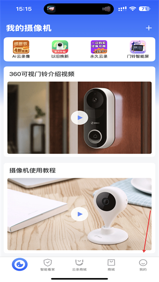 1、打开360智能摄像机,点击底部导航栏中我的选项,进入个人中心页面。