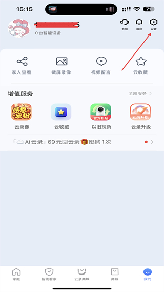 1、在360智能摄像机我的页面,点击右上角的设置图标,进入设置界面。