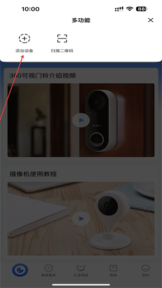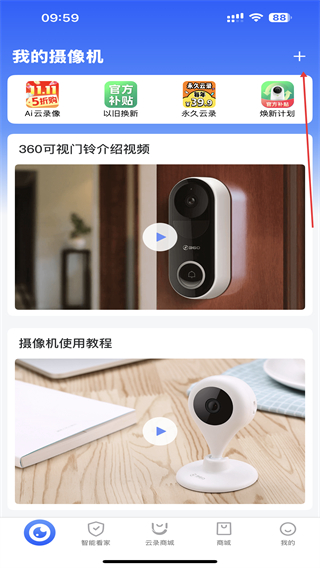 1、打开360智能摄像机的应用,进入时点击右上角+的图标。