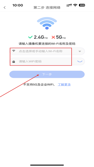 4、在该页面内,输入Wi-Fi名称、密码后,点击下一步即可完成。