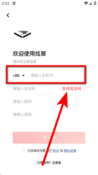 3、在注册页面,输入手机号,点击发送验证码。