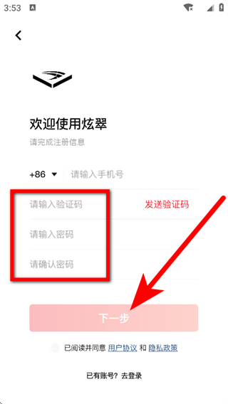 4、输入验证码,设置密码,勾选协议后,点击下一步,完成注册操作。