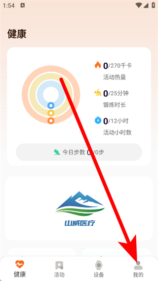 1、打开山威运动健康的健康,点击底部的我的,进入个人页面。