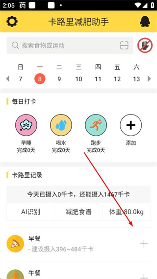 1、在卡路里减肥助手首页,找到早餐板块右侧的+,进入食物添加页面。
