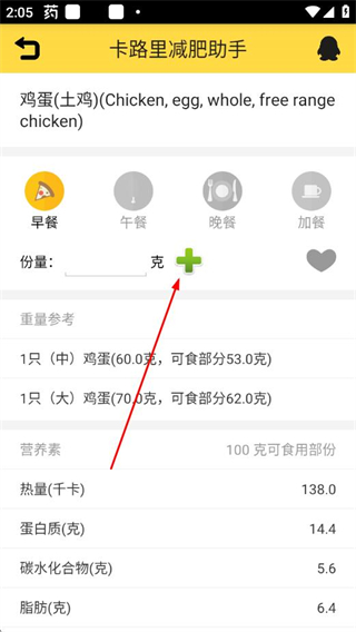 3、在食物详情页设置分量后,点击+,将该食物添加到早餐记录中,完成饮食卡路里记录。