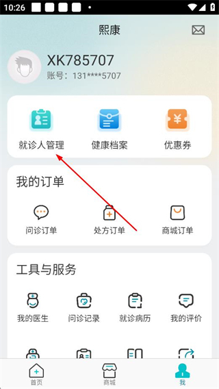2、在个人中心页面点击就诊人管理选项,进入就诊人列表页面。