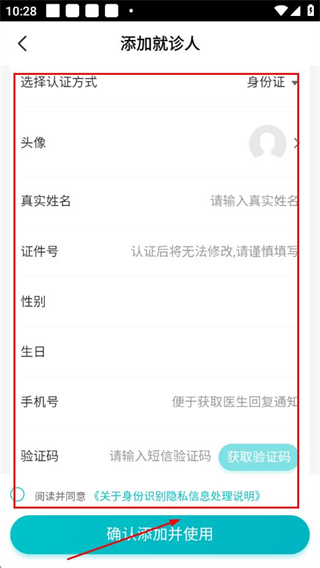 4、填写就诊人姓名、证件号等信息,获取并输入验证码后,勾选协议点击确认添加并使用。