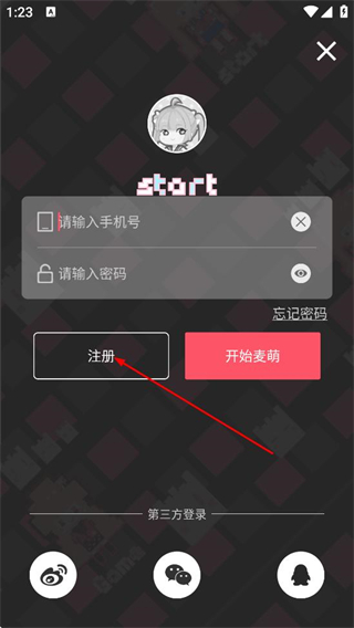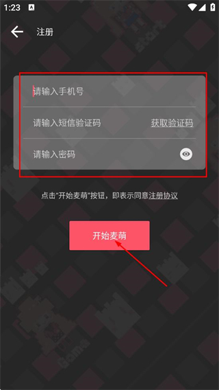 4、在注册页面,填写手机号、验证码,密码,点击开始麦萌,完成账号注册。