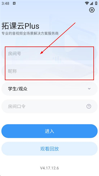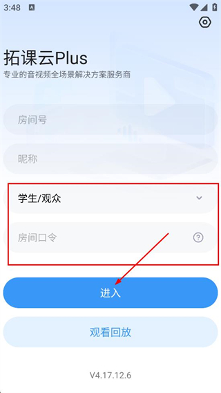 3、选择身份为学生/观众并填写房间口令,点击进入,即可进入房间。