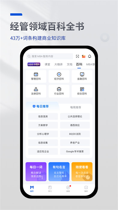MBA智库百科主要针对的是经管、法律、贸易等诸多商务相关领域的专有名词解释。解释通俗、详尽,让即使没有掌握相关学科知识的用户也可以简单明了的了解专业术语的含义,从而在商务办公时,为用户提供更为专业、精准的帮助。