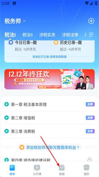 1、在斯尔题库首页,点击底部的商城选项,进入课程商城页面。