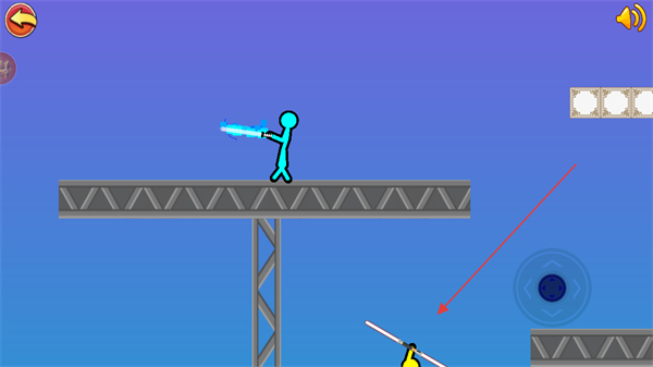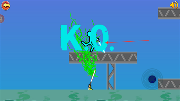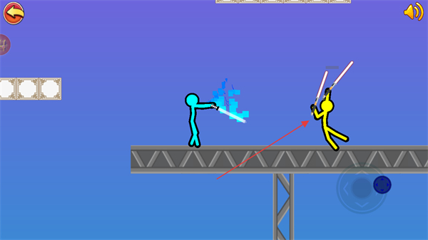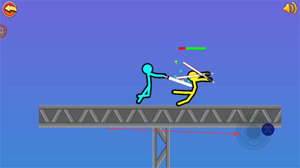 1、操控火柴人释放技能攻击对手,在平台上展开对决,消耗对方血量。