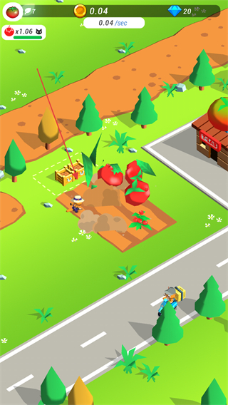 1、点击农田区域,触发作物种植如番茄,自动收获作物并积累金币。