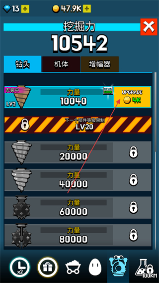 2、返回挖掘界面,点击挖掘机进入挖掘力升级页面,消耗金币点击UPGRADE提升钻头力量,完成挖掘力提升!任务。