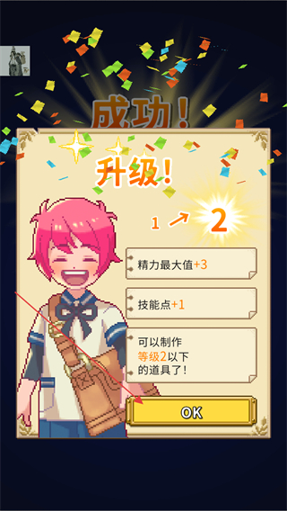 4、角色升级后,查看获得的属性加成,点击OK确认并继续游戏。