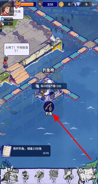 3、找到已建造好的钓鱼椅,点击对应的钓鱼按钮,开启钓鱼操作,储备指定数量的鱼,推进任务进度。