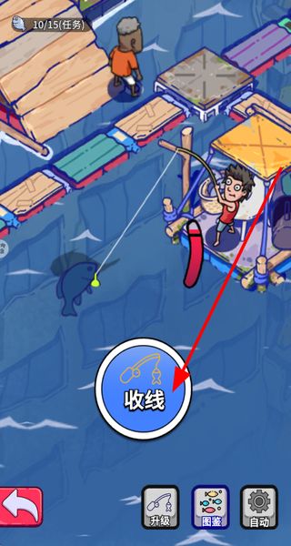 4、在钓鱼过程中,当触发收线提示时,点击收线按钮完成操作,获取对应的鱼类资源,积累任务所需的数量。