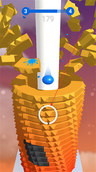 2、小球继续下落,击碎橙色堆栈层,得分增加到179。