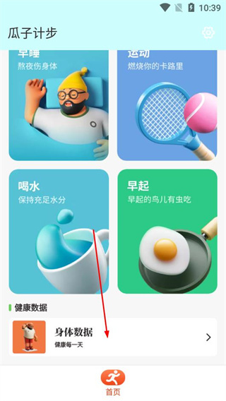 1、在瓜子计步的首页,点击健康数据板块下的身体数据选项。