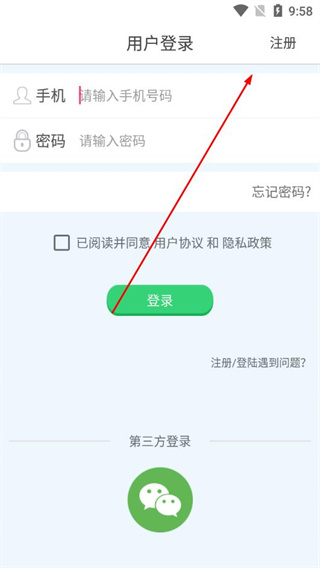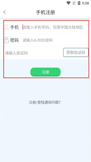 3、在手机注册页面,填写手机号、密码,获取并输入验证码后点击注册。