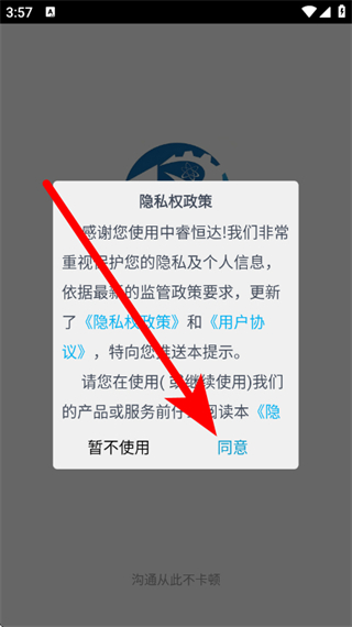 1、打开中睿恒达,在隐私政策弹窗中,点击同意。
