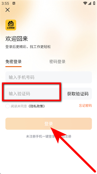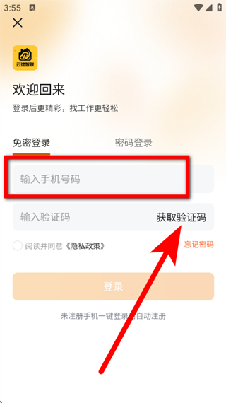 3、在免密登录页面,输入手机号码,点击获取验证码。
