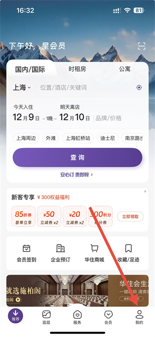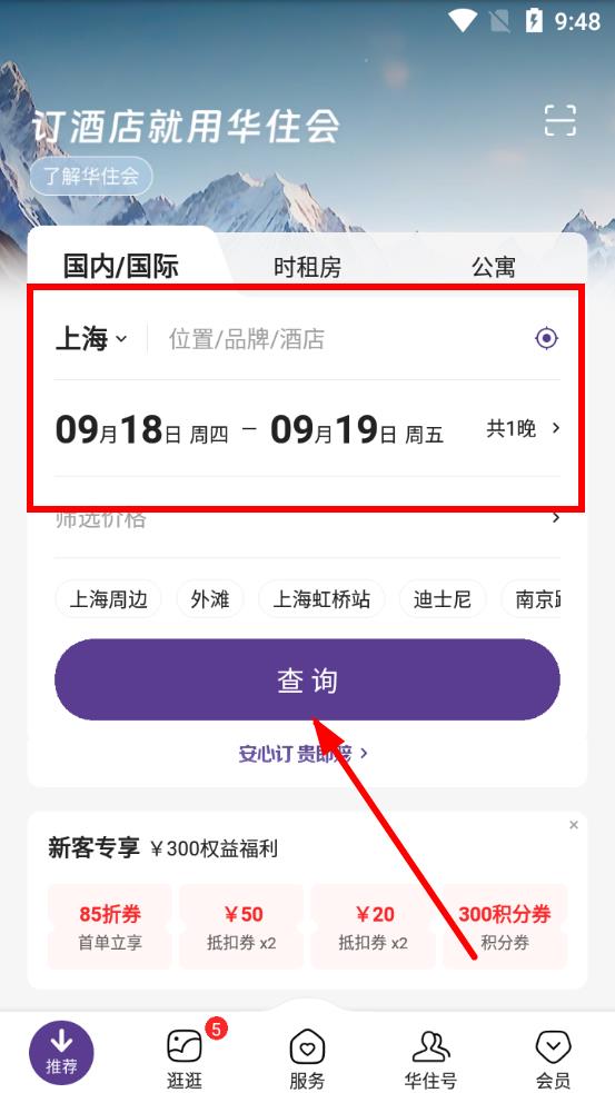 1、打开华住会App在主界面选择国内/国际等类型,并选择入住城市如上海,设定入住及离店日期后点击查询。