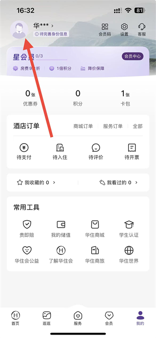 1、在华住会app界面底部,点击我的选项,进入我的个人页面。