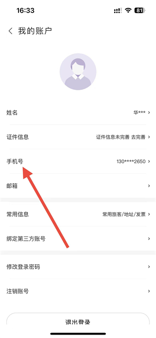 3、在我的账户页面中,找到手机号选项并点击,进入更改手机号的验证页面。