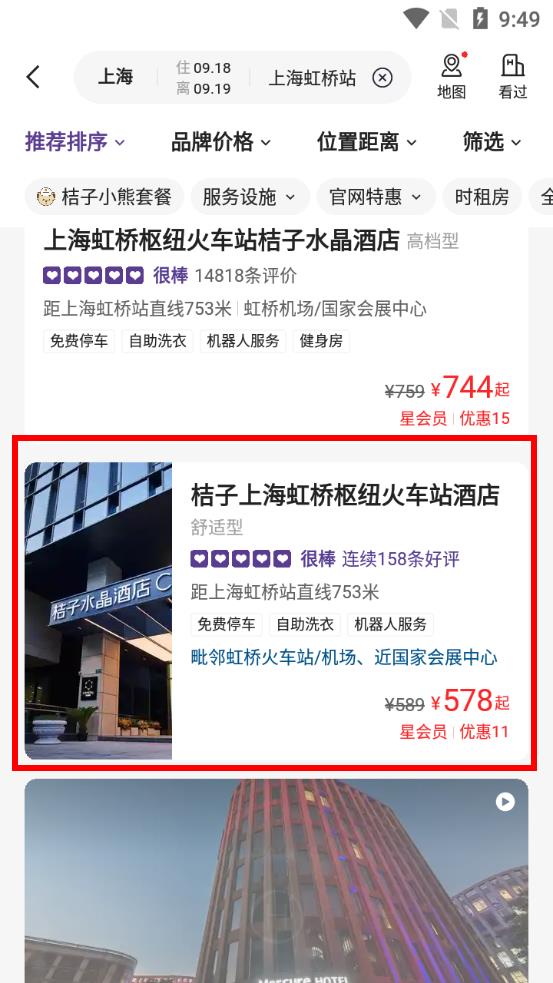 2、在查询结果中找到心仪酒店,比如桔子上海虹桥枢纽火车站酒店并点击进入。