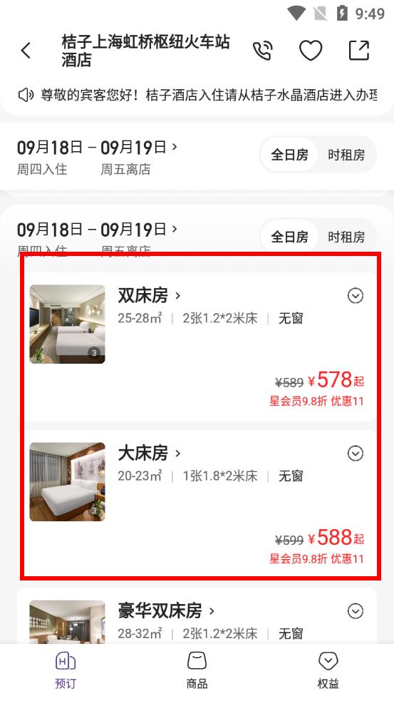 3、进入酒店页面后浏览房型如双床房、大床房等,选择合适房型。