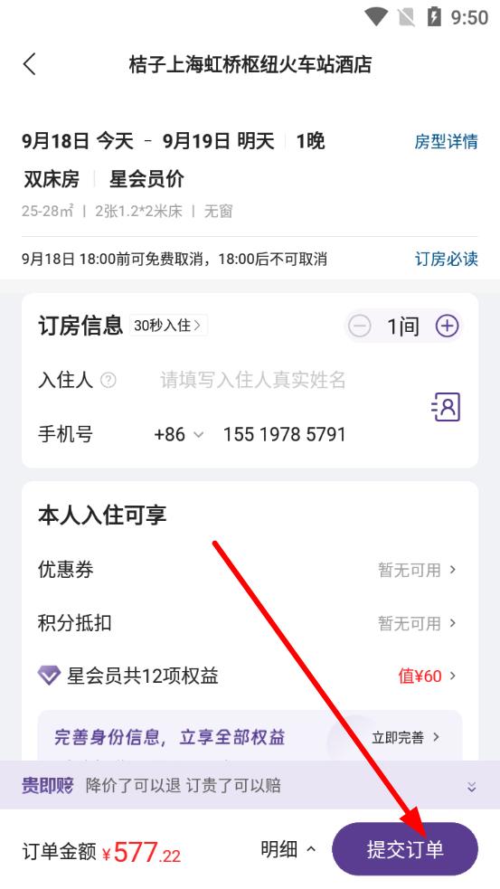 4、填写订房信息包括入住人姓名、手机号等,确认订单金额后点击提交订单完成预订。