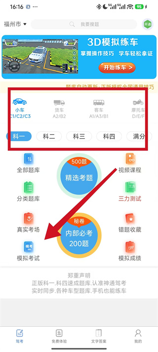 1、打开神通驾考APP,在首页选择目标车型和要练习的科目,在页面中找到模拟考试选项并点击进入。