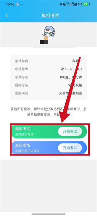 2、进入模拟考试后,然后选择模拟考试或真实考场对应的开始考试。
