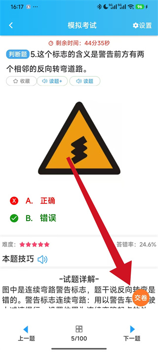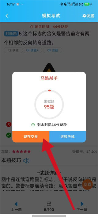 4、点击页面中的交卷后,再选择现在交卷,即可完成本次模拟考试。