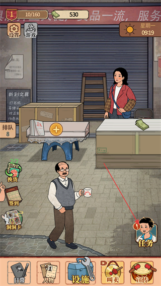 3、复古画风营造浓厚年代氛围,老旧货架、手写价签、泛黄墙面等细节设计,让整个经营场景充满真实的怀旧质感。