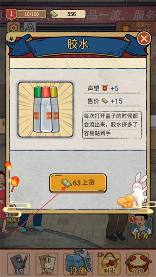 2、进入商品界面,消耗63金币给胶水上货,完成任务进度要求。