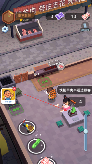 2、站到烤架旁开始烤串,点击加速按钮提升烤串速度,满足顾客4串的需求。