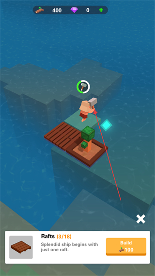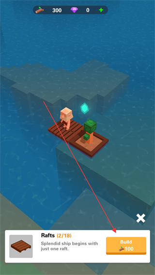 1、在界面点击Build消耗100资源,建造Rafts扩展木筏,推进造船进程。
