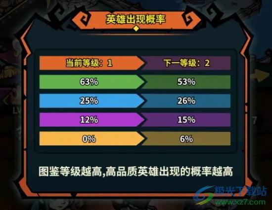3、每次进行招募都会获得图鉴等级经验,图鉴等级提升,则刷新出来的金色品质的英雄的概率更高。