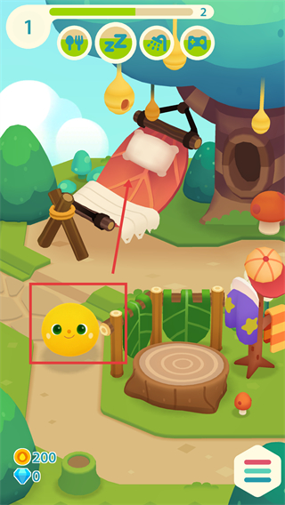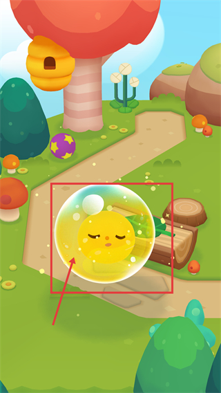 1、界面是卡通场景,点击标注的泡泡里的黄色角色,触发互动流程,开启该角色对应的照顾类关卡玩法,推进游戏进度。