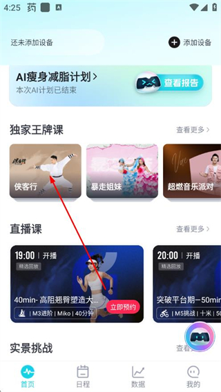 1、打开merit超燃脂app首页,在独家王牌课区域选择目标课程,点击进入课程列表页面。
