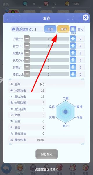2、进入加点界面使用剩余素质点,分配到力量智力等属性上,调整角色能力后点击保存加点。